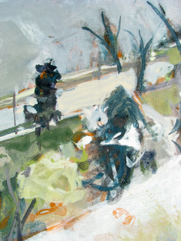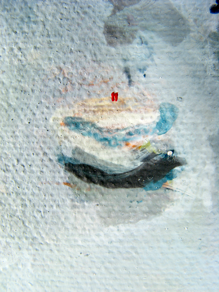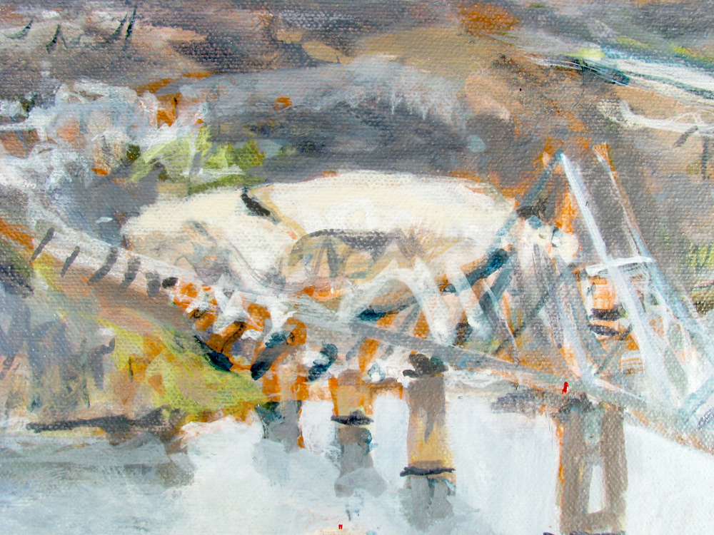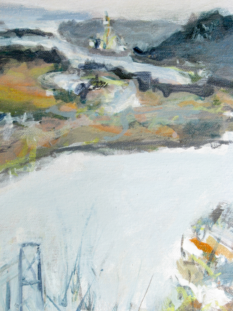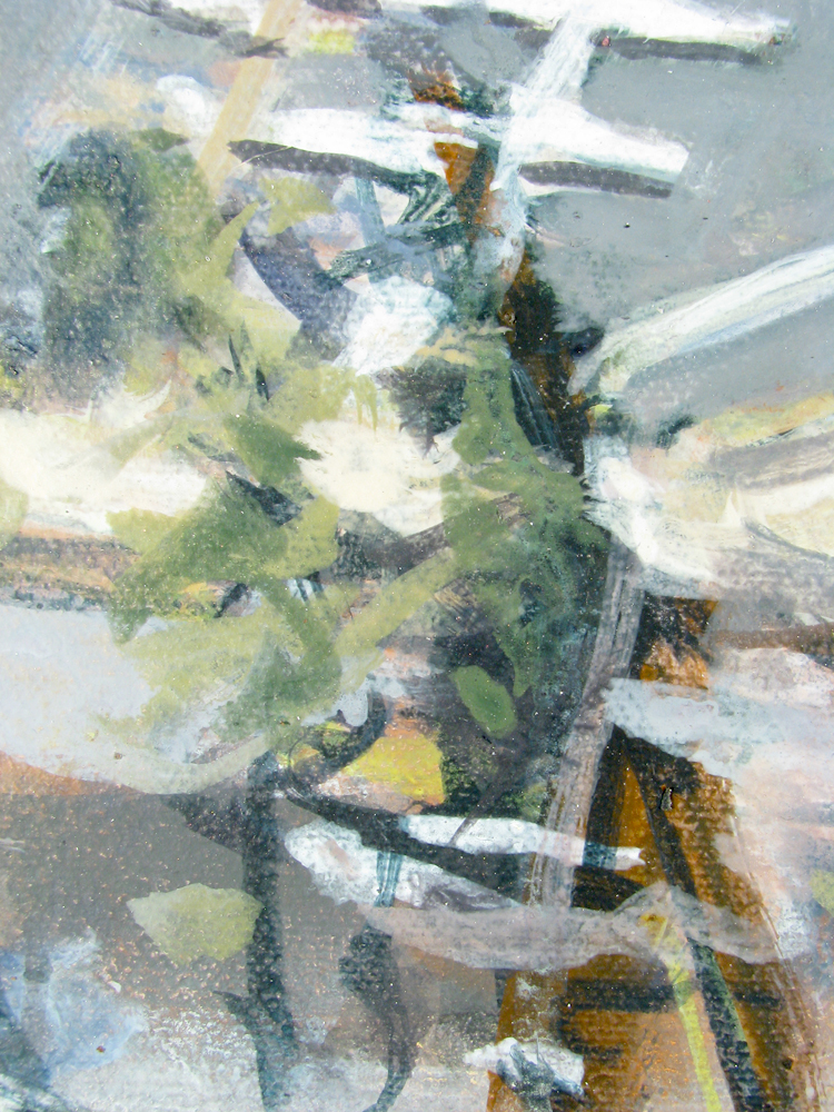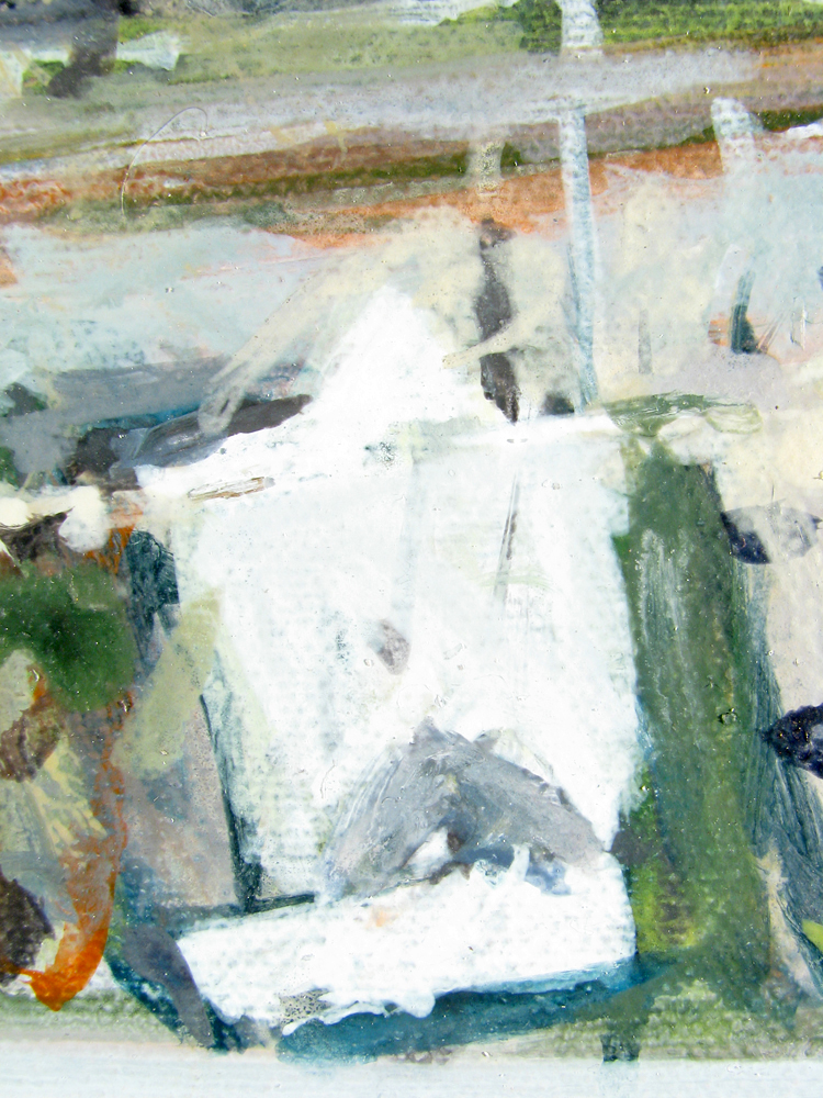 Summerwind, City Dock, Annapolis Maryland 210708 16"x20" acrylic on canvasIn this full view the abstract forms (along with the weave of the canvas and physical reality of the paint) so apparent in the detail are subdued by our sensation of a scene conventionally presented. Just now, 12 weeks after painting Summerwind, I notice the anchor with its trailing oblique lines seems an upward moving shooting star. The oblique upward motion of the anchor with its trailing lines, perhaps closer to us than anything else in the painting, and detaching itself from the ship's prow, is in duet with the farther from us and more tethered but draping-waving motion of the flag. The motion of the anchor (of which I was unaware during the making of the painting) is indicated as in a diagram or cartoon, while the motion of the flag (which I was aware of during the making of the painting) shows itself more naturalistically. The painting can be seen at Jo Fleming Contemporary Art, 68 Maryland Avenue, Annapolis MD 21401.