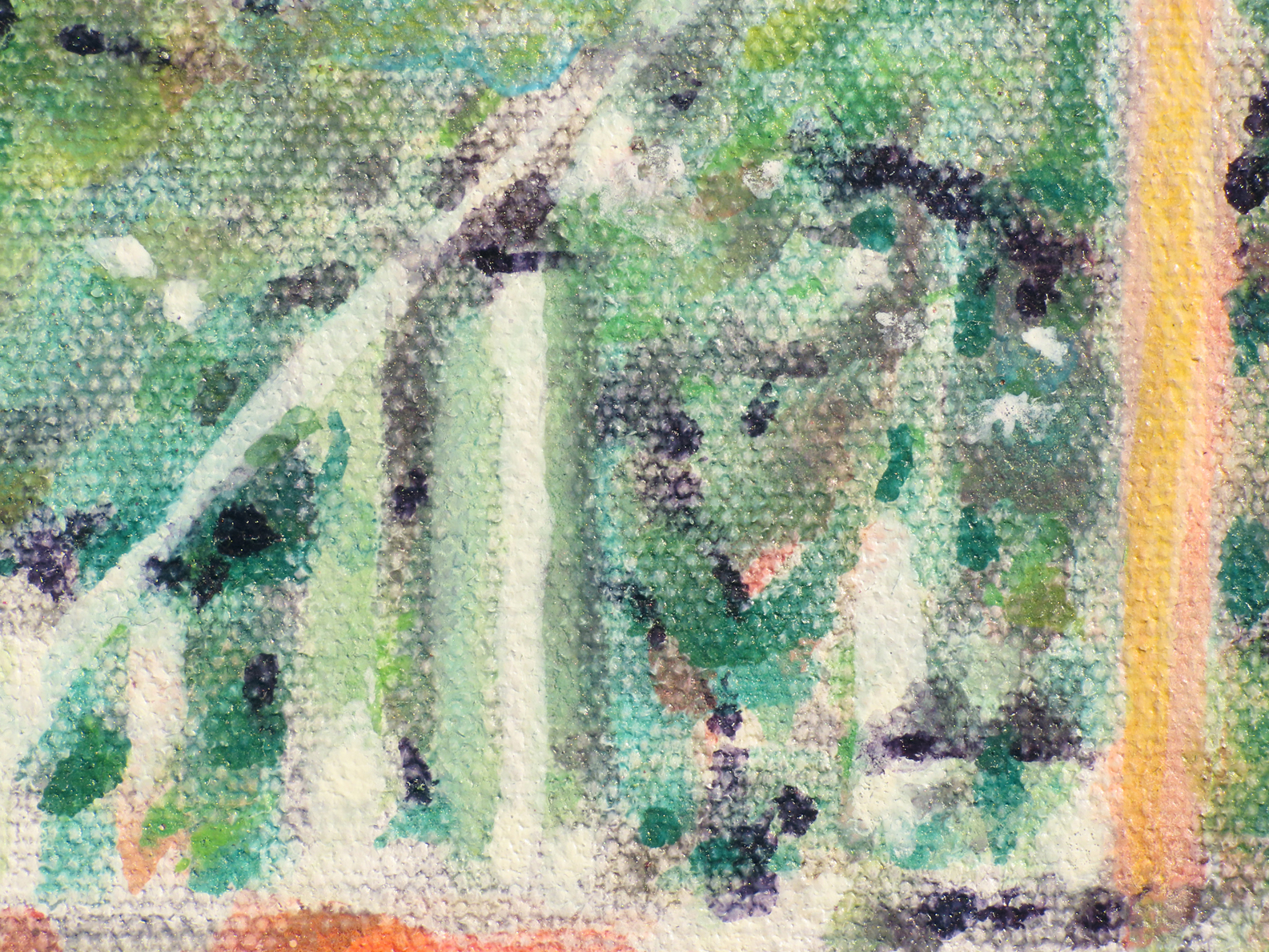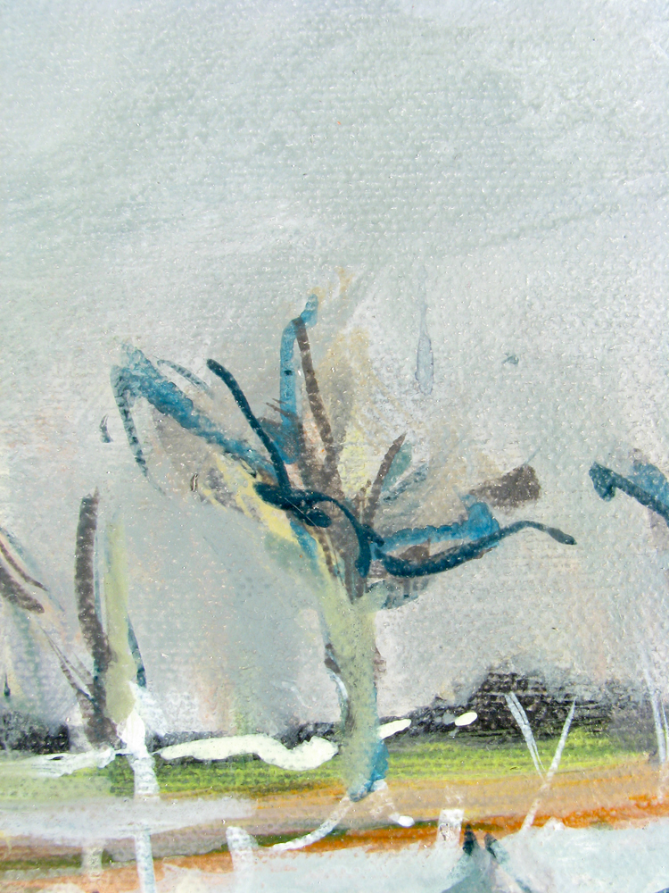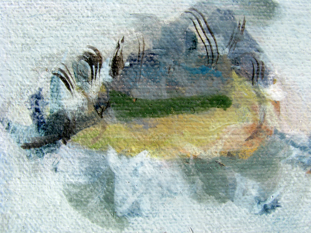 When I examined this close up detail (of the painting shown below in its entirety) many weeks after I had made the painting, I was surprised how the green, the structure, and the density of space remind me of Cézanne. The texture of the canvas and the abstract forms are other matters altogether. (Indeed, one of the mysteries of painting, as in the rest of our world, is the co-mingling of distinct, separate worlds.) The close-up reveals a world too small to be seen with the unaided eye either during the making of the painting or when displayed on a wall. This is the inverse of the case of the Nazca Lines, which were made at ground level and which in our day we examine from a height of c.1600 feet. 1 Without much difficulty we can perceive both the close-up and the full view of Summerwind as being views of the same painting, yet the world in each is quite distinct. At what close proximity (what micro zoom) or far remove (zooming out) might we lose our sense of the image being that of a painting, at all?